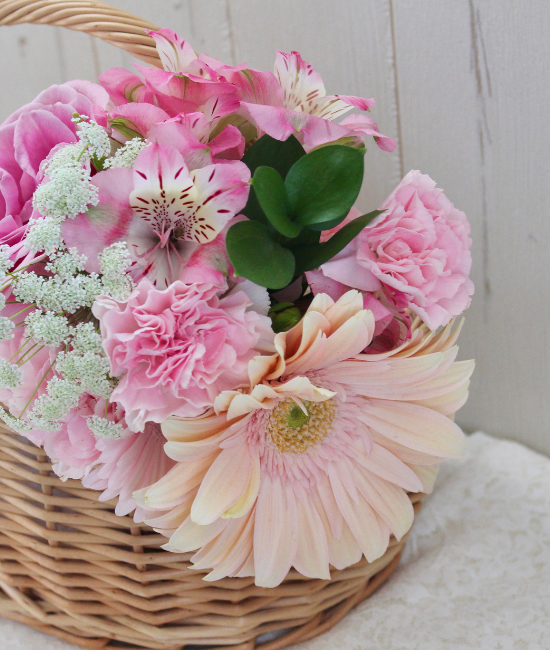 今月はかわいいピンク系の花籠をリクエストしていただきました。